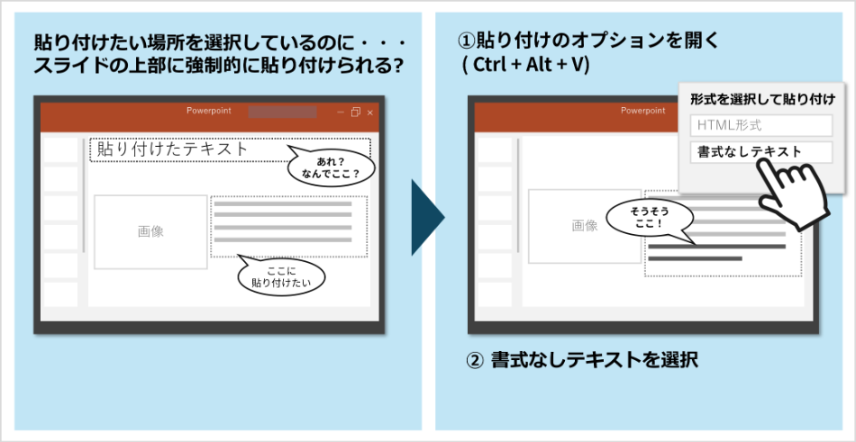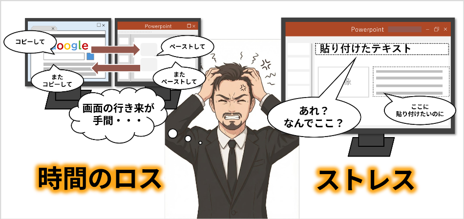あるいは、テキストが思わぬ位置に貼り付けられ、その都度、やり直しや配置の修正が必要になることも。