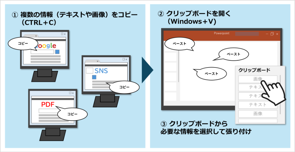 コピペしたい情報を先に全部クリップボードコピーしておいて、後で一気に貼り付けることができます。